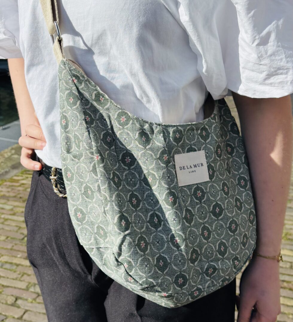 Deze unieke halve maantas is uitgevoerd in een fijne half panama stof met een geometrische print in groentinten.